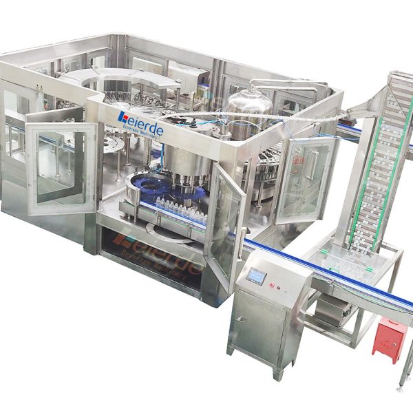 CGF series PET bottle washing, filling and capping three in one filling machine is a kind of high filling precision and adjustable filling speed water bottling machine. It adopts bottle-neck block technology, not only avoid bottle-neck second pollution, but also can suitable for different designed bottle shape. By this technology, usage scope of this kind of machine has been enlarged. According to different model, capacity of the machine is in the range of 1,000 BPH to 24,000 BPH. Machine is forced by frequency variable motor, controlled by world famous brand PLC and other electronic components, such as Mitsubishi, Siemens, Airtac etc.